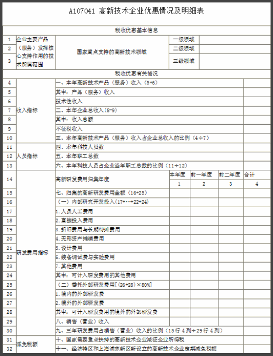 (3)A107041——高新技術(shù)企業(yè)優(yōu)惠情況及明細(xì)表